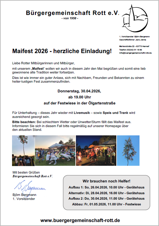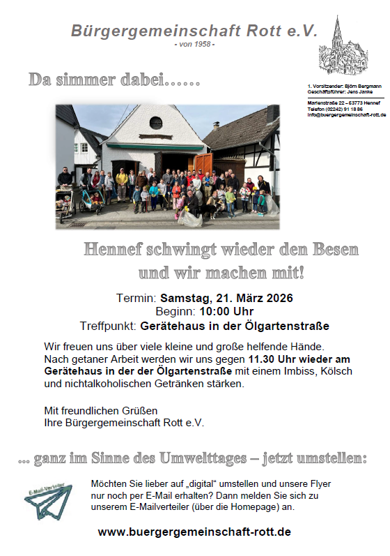 Es werden auf unseren Rotter Veranstaltungen immer wieder Bilder gemacht, die sehenswert sind und geteilt werden sollten. Sprechen Sie uns an. Wir sind offen für Ihre Bilder aus Rott, ob Landschaftsbilder oder Veranstaltungen, alte und aktuelle Fotos. Bitte melden Sie sich bei Brigitte Winterscheid - Telefon 932 96 30